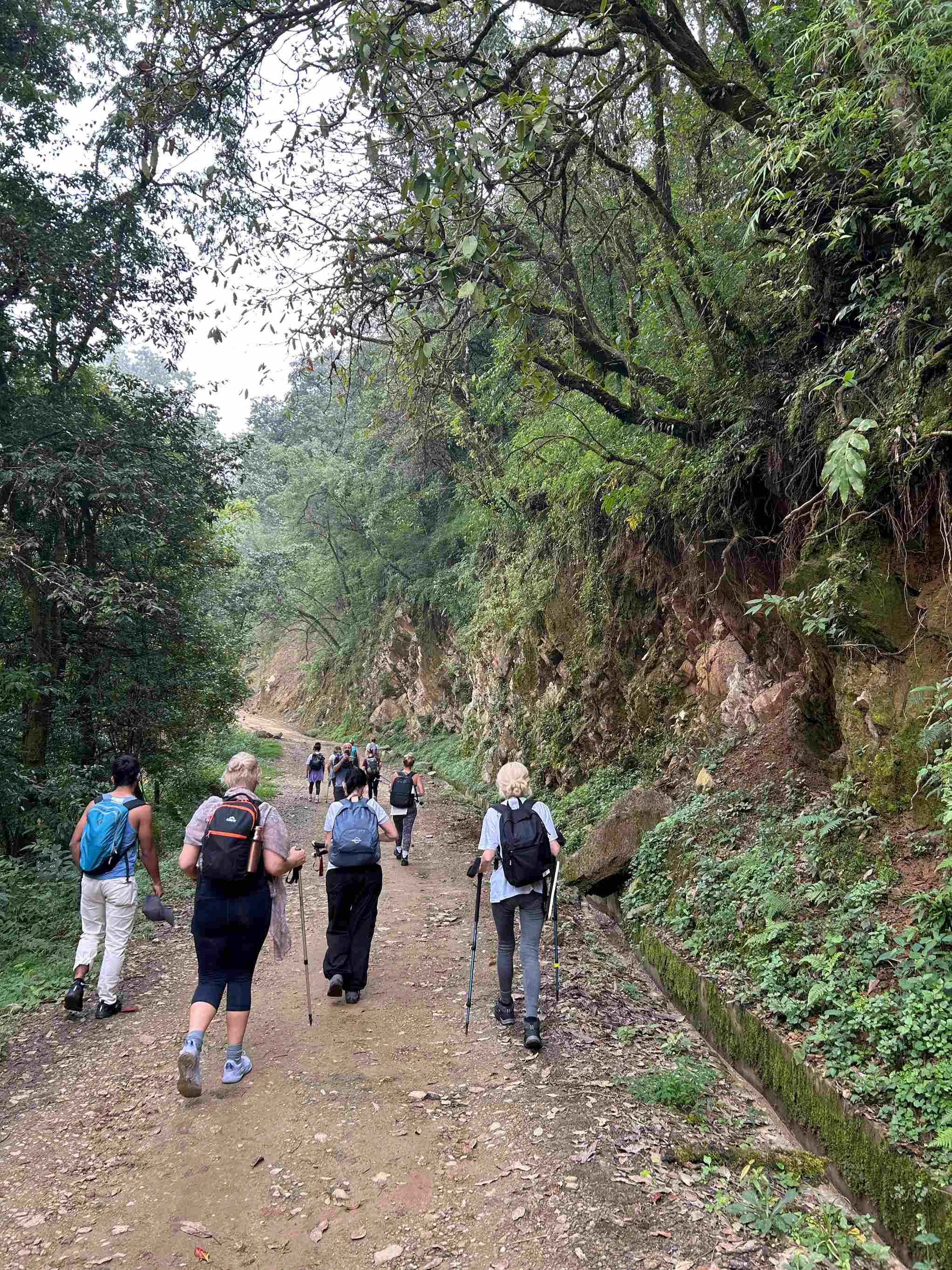 The walk begins gently, winding through thick rhododendron, oak, and magnolia trees. During spring, the forest turns bright with flowers, making the entire route colorful and lively. Along the way, there are several clearings and resting points where you can stop for water or snacks while enjoying short glimpses of the valley.